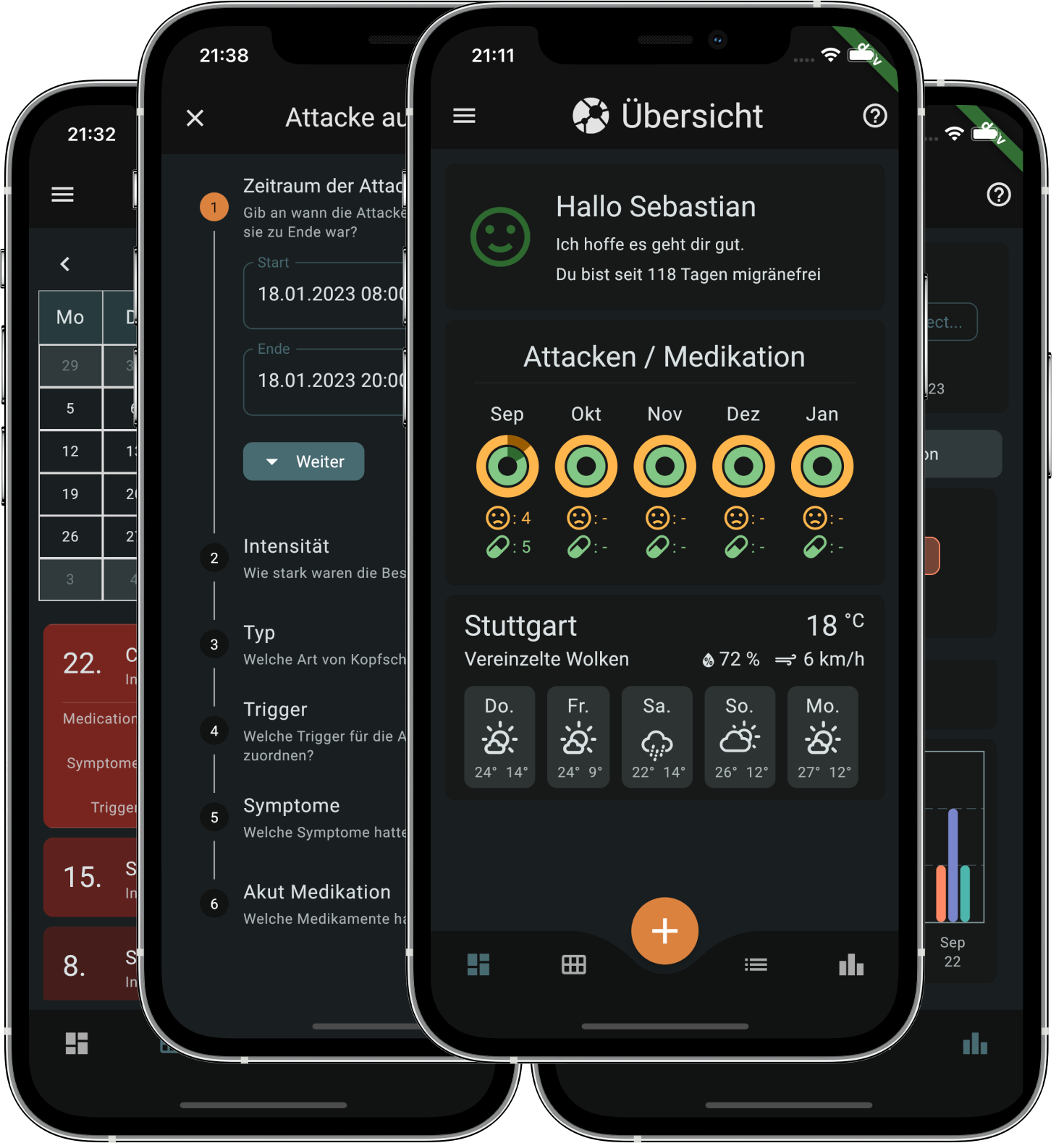 Unsere App soll dir helfen, deine Migräne besser zu verstehen und erfolgreich zu behandeln. Hier kannst du alles rund um deine Migräne aufzeichnen, auswerten und mit deiner Neurologin / deinem Neurologen teilen.